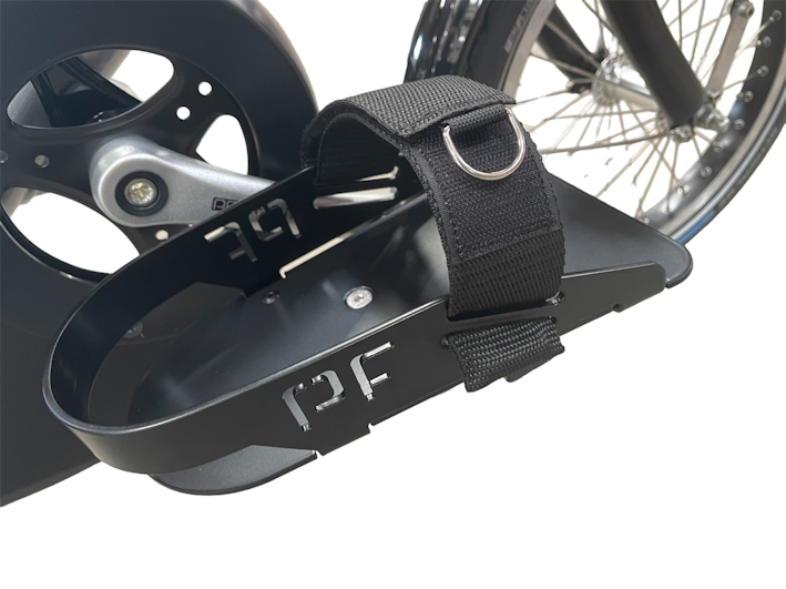Fodstøtter udført i aluminium og i sort bemaling. Den aftagelige støtte glides ind over pedalen og fastspændes ved hjælp af en vingemøtrik med fingrene. Kontravægten sikrer, at støtten altid er orienteret opad. Foden sættes ind i fodstøtten og fastholdes af en kraftig velcrorem over vristen.