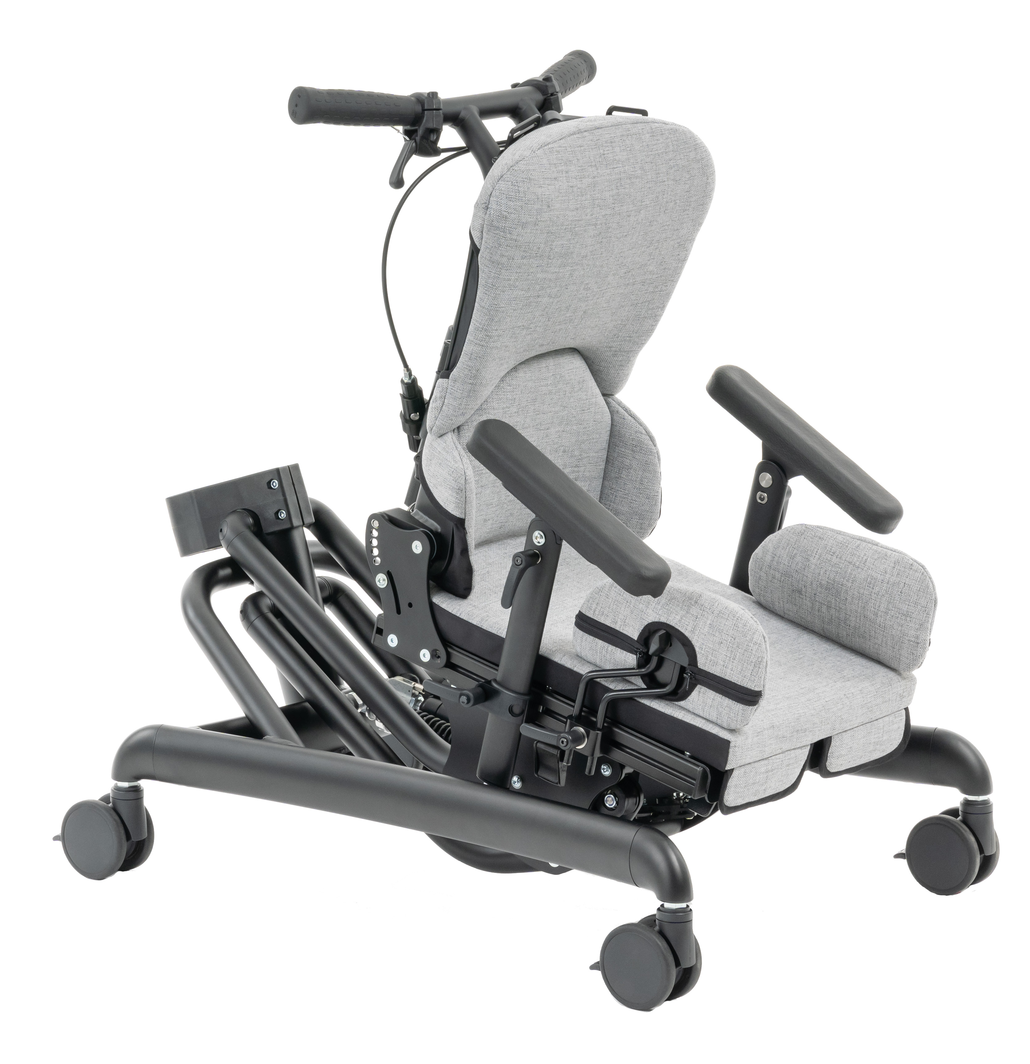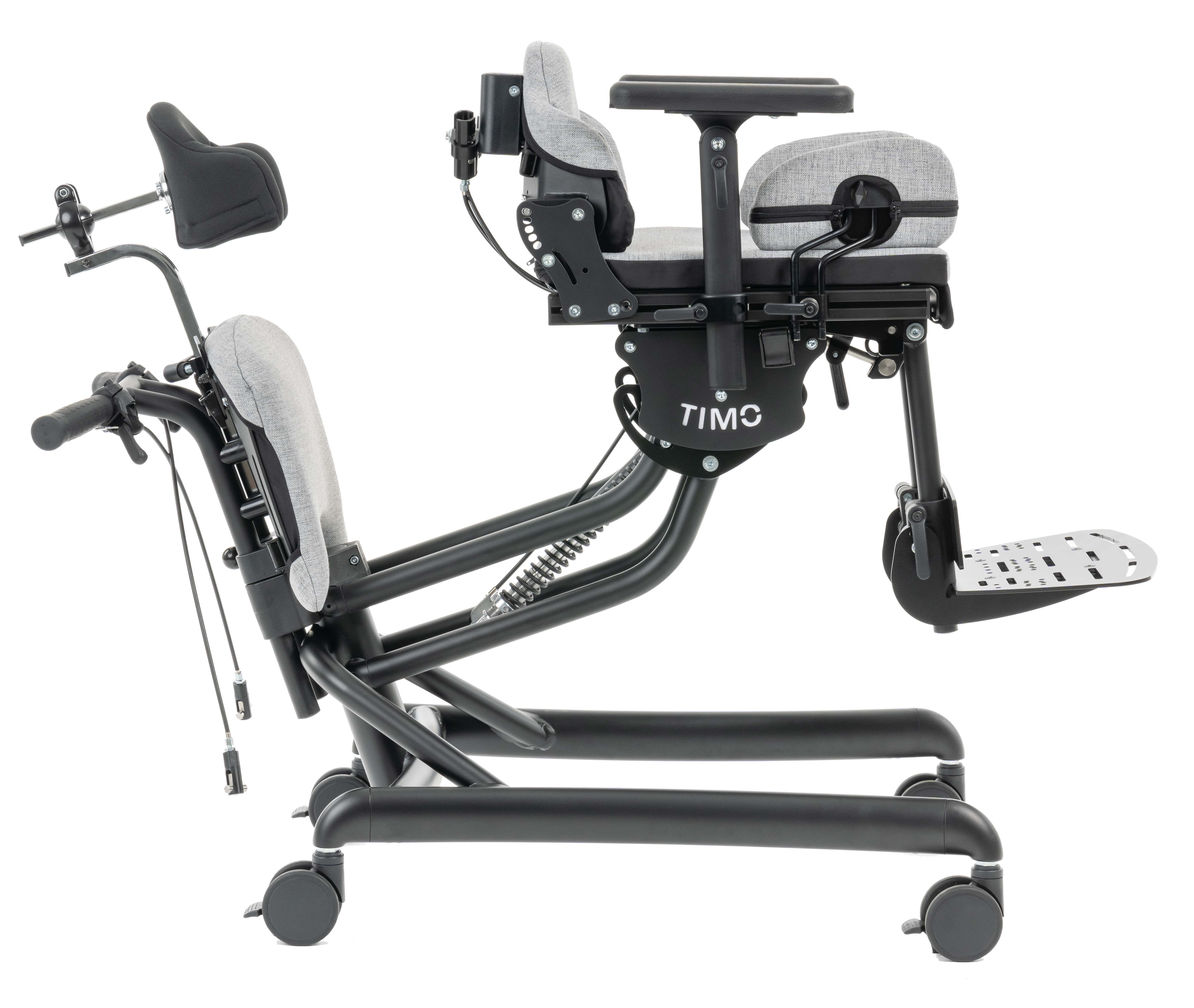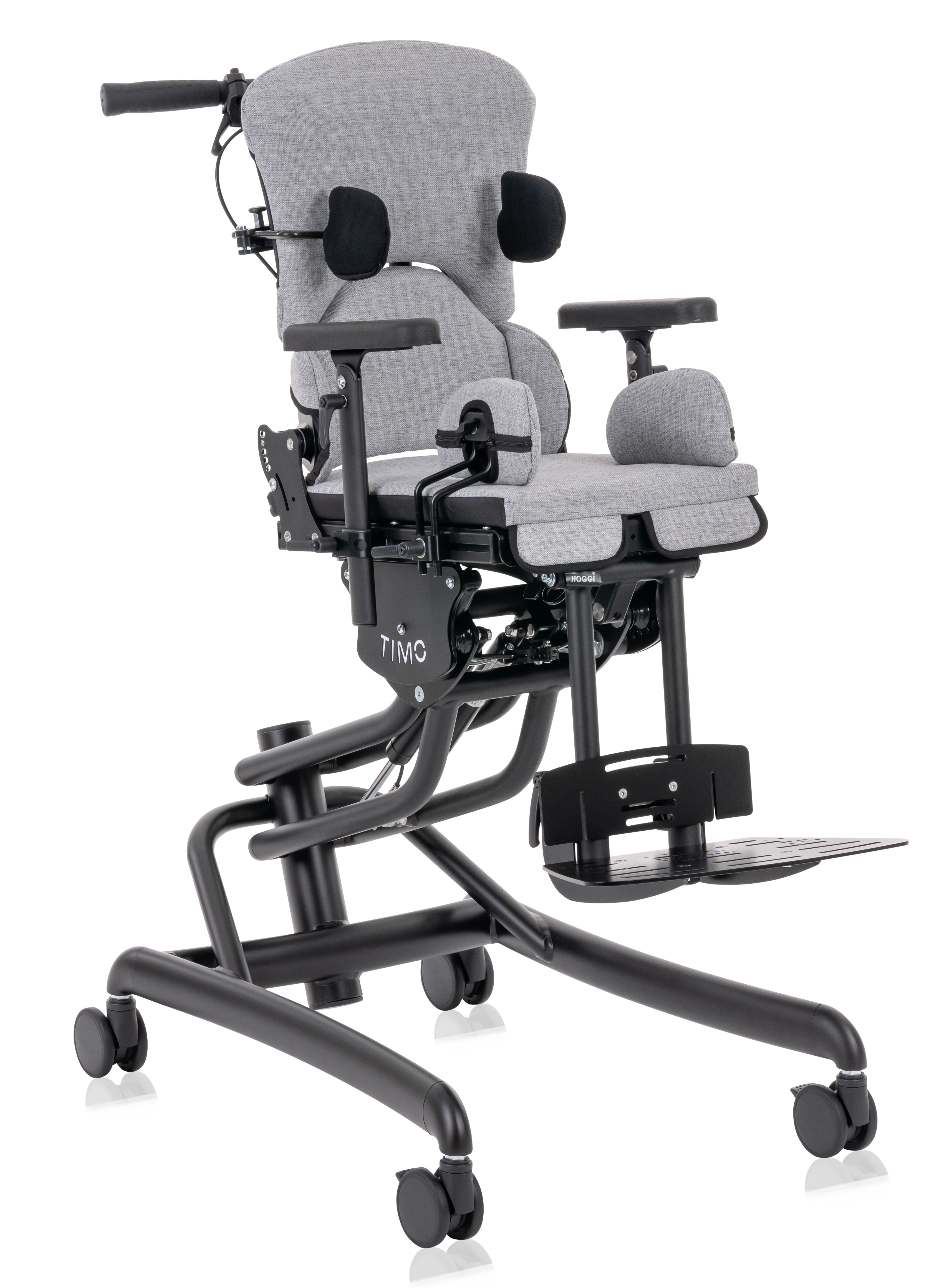 Timo er en højdejusterbar terapistol med ryg- og sædevinkling. Ryg og fodstøtte kan afmonteres til træning eller leg ved gulv. Kan udstyres med ekstra udstyr til dem der har lidt eller meget behov.