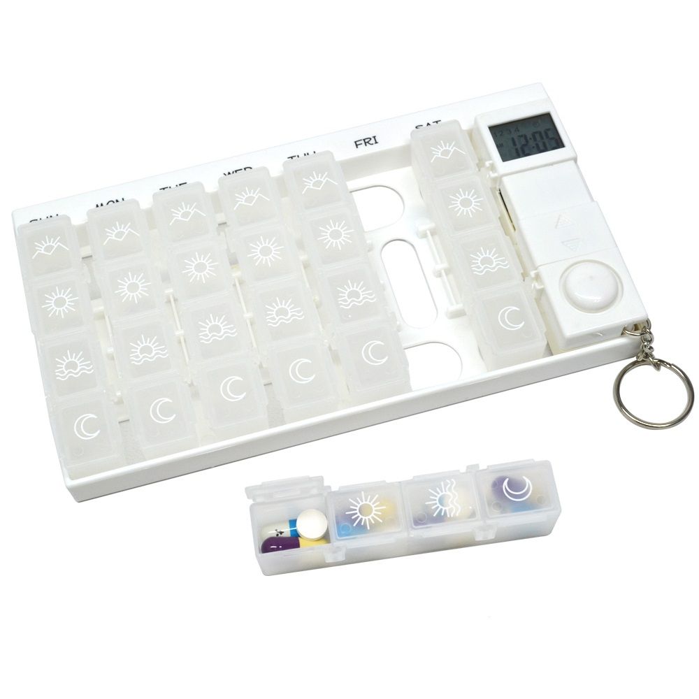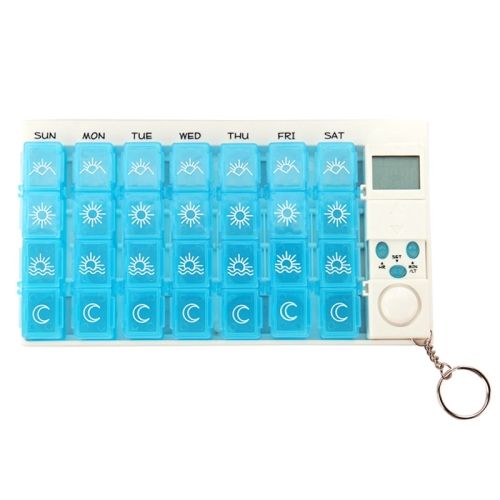 Pilleæske med en timer og 7 pilleæsker med 4 rum i hver æske, designet som en nøglering.