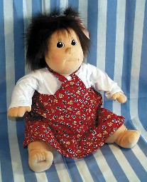 Dukken vækker medfølelse og indbyder til samtale. Hold dukken på venstre arm i hjertesiden, så du får øjenkontakt. Dukken kan selv sidde, da den er lidt tung bagi. Dukken vækker stor glæde og åbner op for kommunikation hos mange demente. Vaskbar. Højde: ca. 36 cm.